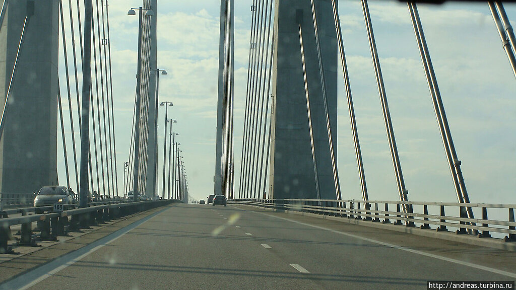 Из Швеции в Данию въезжал по известному во всём мире Эресуннскому мосту, длина которого составляет 7 845 метров. Это самая длинная совмещенная дорога и железнодорожный мост в Европе, соединяющие Копенгаген и шведский город Мальмё. Особенность моста в том, что ближе к датской территории он переходит в тоннель длиной в 4 050 метров на искусственном острове Пеберхольм. Красивое сооружение, но очень дорогое. Проезд по мосту для парней-французов, с которыми я ехал, обошёлся в 54 евро. С грузовиков тут берут и все 200 евро. Неудивительно, ведь строительство моста обошлось в 30,1 миллиарда датских крон и окупится только в 2 035 году. Мои фото моста не очень, но вы можете в интернете найти уникальные снимки.