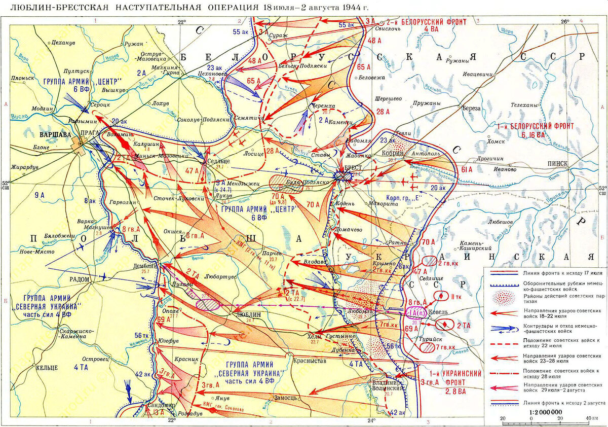 25 июля 1944 наши войска вышли к реке Висла. А в это время правому крылу фронта предстояло сражение за Брест, оставленный в июне 1941 года. Причем командование вермахта собиралось оборонять этот важный транспортный узел до последнего солдата. С боями части 65-й и 28-й армий подходили к городу с севера, постепенно охватывая фашистские части. В ответ враг, стянув силы, мощно контратаковал с применением бронетехники и авиации, но остановить советские части это уже не помогало. С юга наступала 160-я стр дивизия, постепенно отрезая вражеский гарнизон от основных сил группы армий Центр.