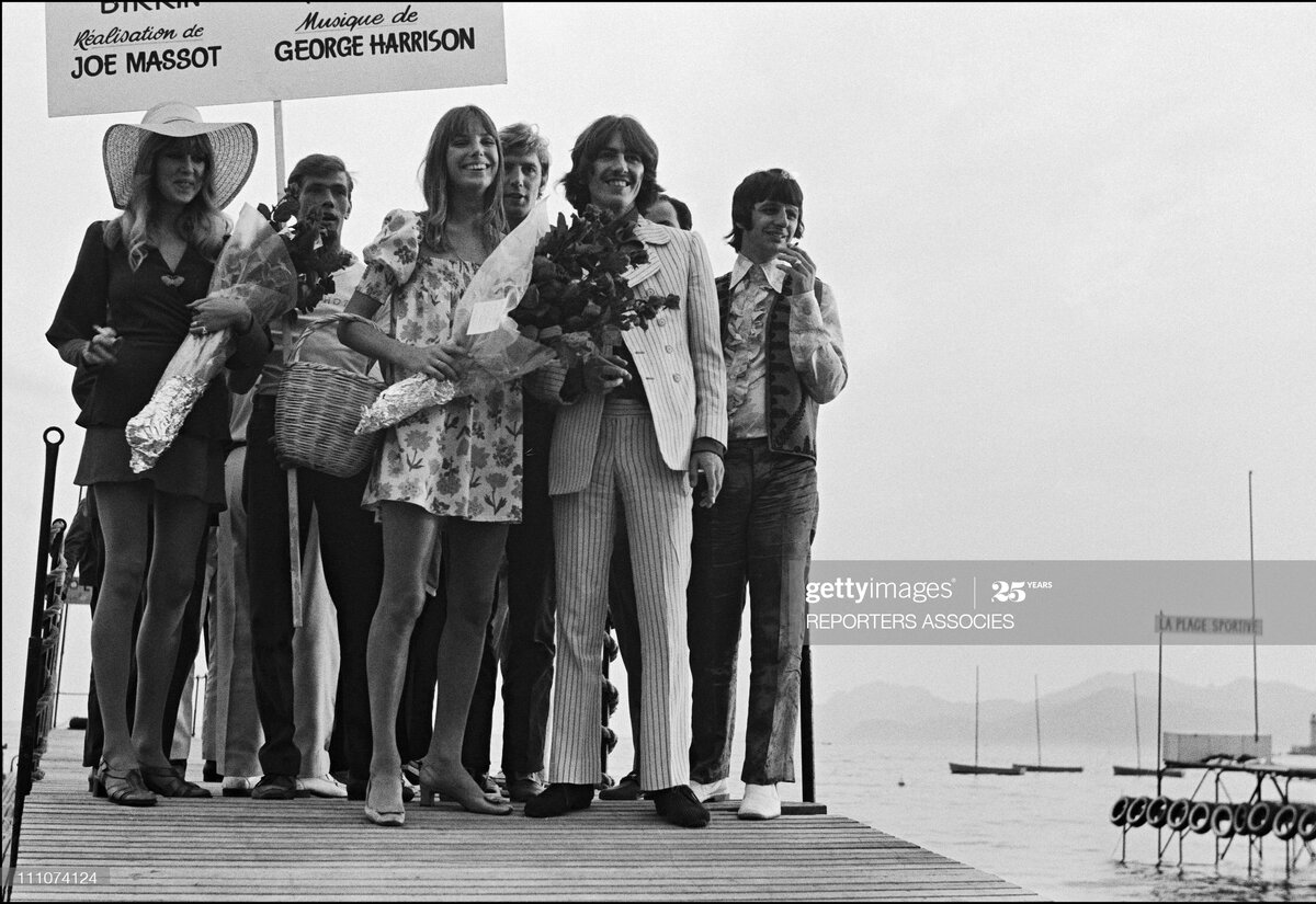 Вот мы и добрались до той фотосессии, снимок с которой стоит как заглавный. Jane Birkin, George Harrison и Ringo Starr. Великолепная компания. К слову тот фестиваль был сорван из-за беспорядков. 1968 год же. Во Франции тогда было жарко.