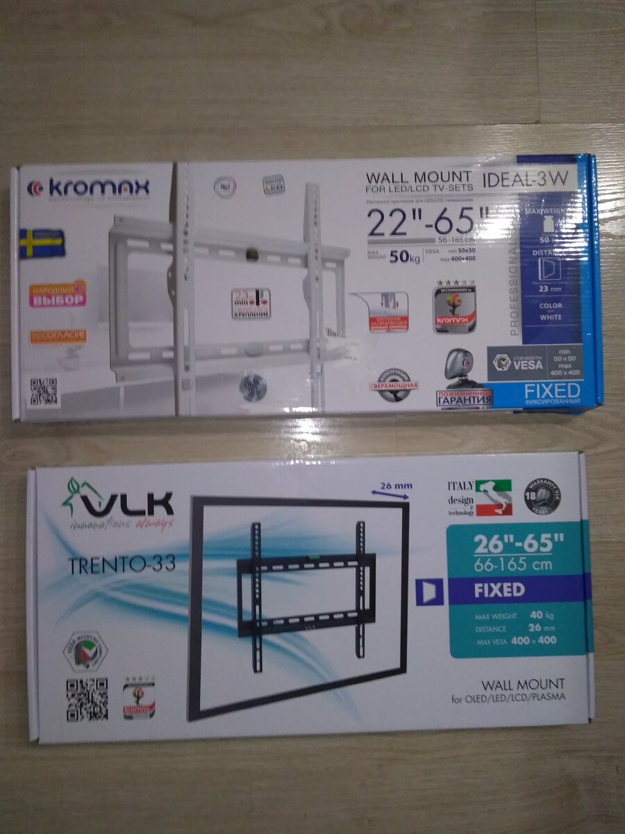 Как-то гуляя в магазине, на полках увидел кронштейны Kromax Ideal 3 26-65" и VLK Trento 33 26-65". Я задал вопрос консультанту: «А чем они отличаются?». Консультант замялся и не нашел ничего другого ответить как: «Kromax лучше!» . К его удивлению я взял два, и сказал,что сравню их дома.