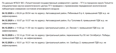 В пятницу, 4 декабря, жители Тольятти вновь жаловались на густой туман в городе, который сопровождался неприятным запахом (в частности на улицах Победы, Горького и Мира). Однако на сайте Администрации г.о. Тольятти в разделе «Экология» в этот день были опубликованы результаты исследования экологической лаборатории. Согласно им в городе превышений ПДК зафиксировано не было.