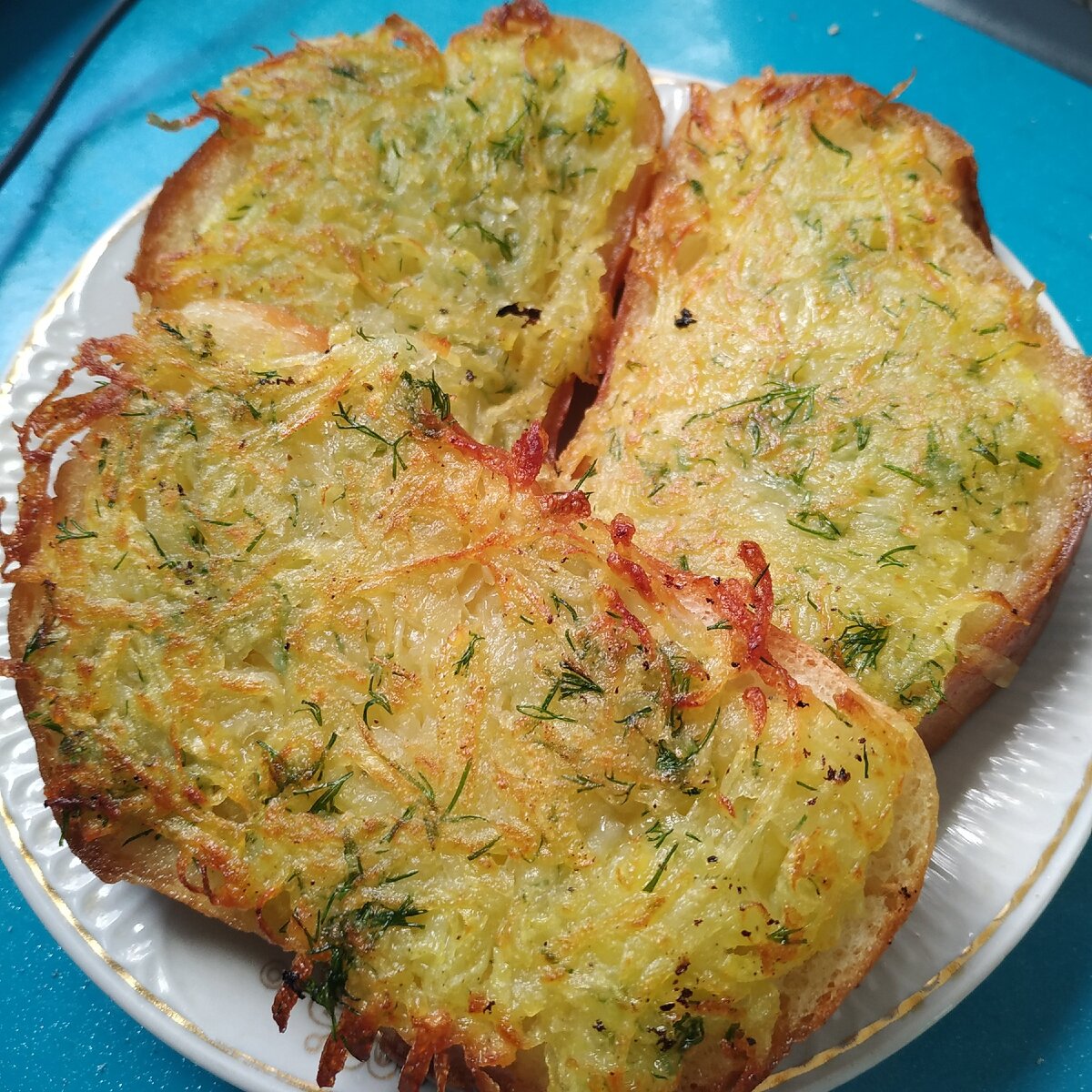 Вилочкой на ломтики хлеба выкладываем картофельную смесь и аккуратно прижимаем её к хлебу.