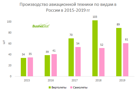 По данным «Анализа отрасли авиастроения в России», подготовленного в 2020 г, в 2015-2019 гг в стране наблюдался рост производства авиационной техники. В 2019 г в стране было выпущено 150 вертолетов и самолетов – в 2,2 раза больше, чем 2015 г. Основным драйвером роста выпуска авиационной