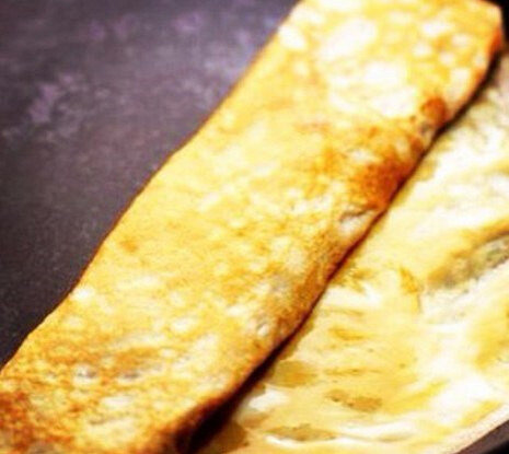 3. Вылить яичную смесь на разогретую сковороду, смазанную маслом, жарить с одной стороны пару минут, как схватится – перевернуть на другую. Накрыть крышкой и на слабом огне довести до готовности. Блин из двух яиц лучше жарить на большой сковороде, иначе перевернуть его может быть проблематично.