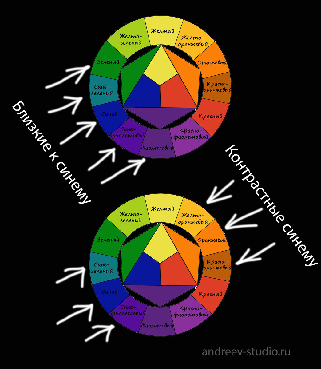 Рядом расположенные цвета (см. схему выше) называются близкими. Находящиеся рядом цвета вызывают ощущение "перетекания" одного цвета в соседний. Применение близких цветов с синим умиротворяет и успокаивает. Такое сочетание приятно к восприятию и, чаще всего, хорошо воспринимается разными людьми.
