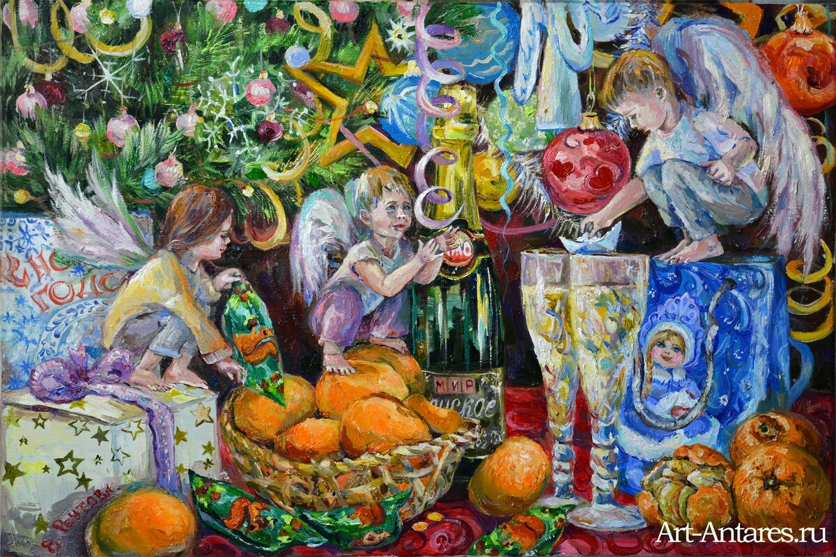 Доброе таинство на новогоднем столе. Малыши Ангелочки радуются празднику, пока все спят. Среди подарков, ароматных мандарин, елочных игрушек, любимых конфет. Маленькие чудеса случаются гораздо чаще чем кажется. Вокруг очень много доброты и красоты. Эта картина мое пожелание добра и счастья в каждую семью. Пусть будет мир в ней и надежд