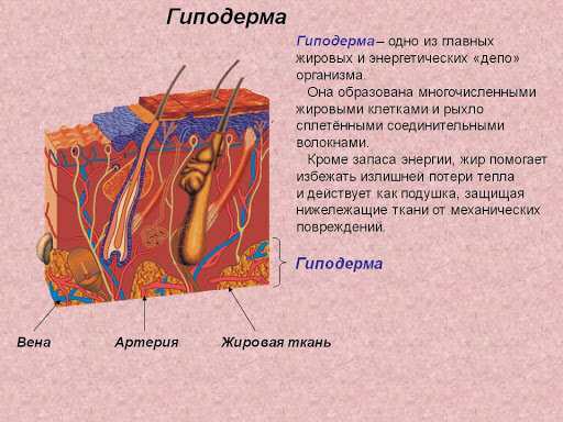 Гиподерма также называется подкожно-жировой клетчаткой. Именно здесь хранятся запасы жира в организме.
