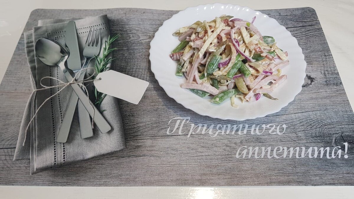 Ингредиенты: ветчина, стручковая фасоль, маринованные огурцы, лук, яблочный уксус, яйца, майонез.