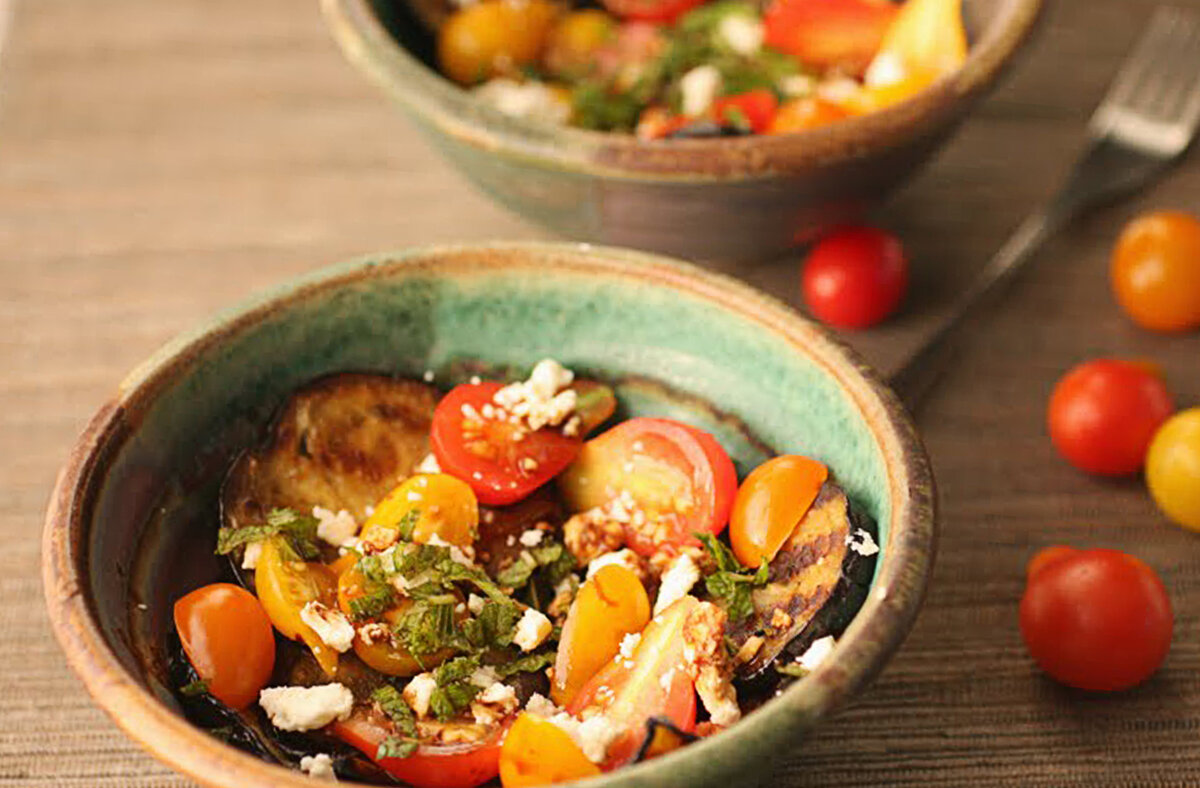 - Чуть-чуть раздавите помидоры и добавьте в блюдо к баклажанам. Порвите моцареллу и так же добавьте в блюдо.