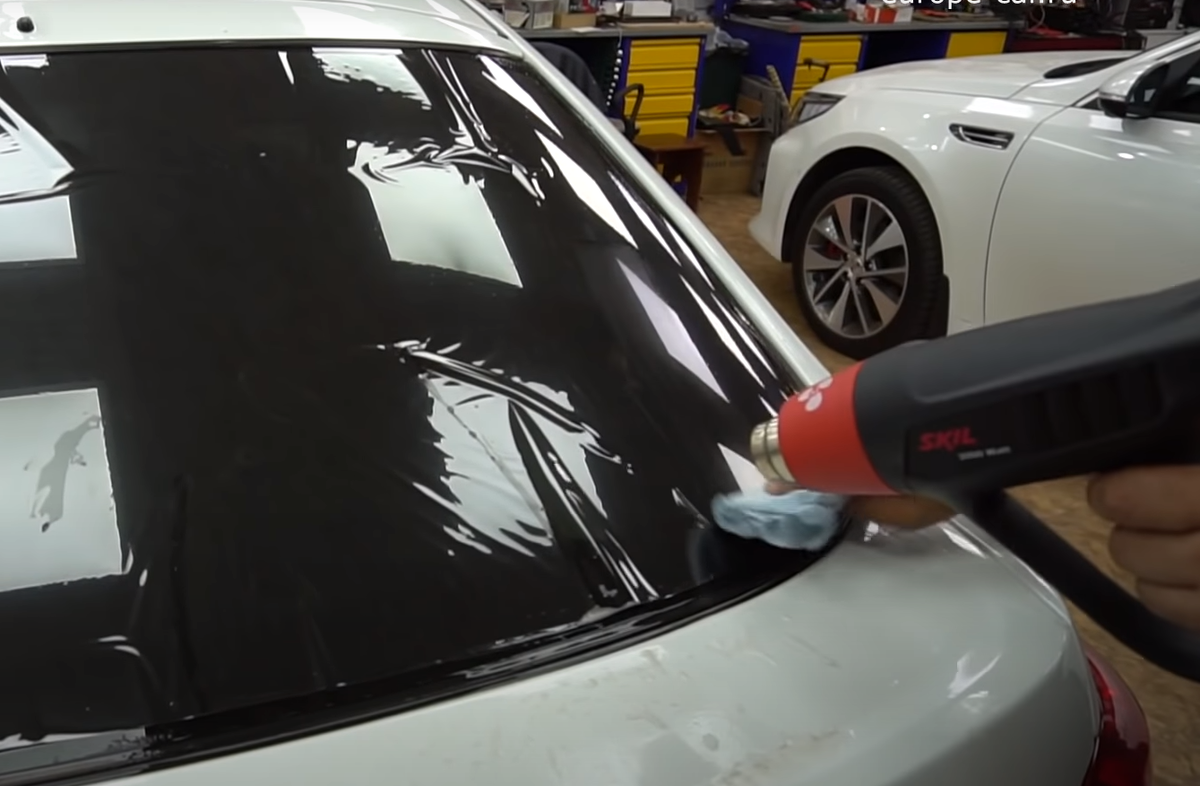 - Перед тем, как разрезать пленку, нужно определить, в каком направлении она плавится. При изогнутом стекле нужно подогнать пленку по размеру. Для этого тонировочную пленку снаружи накладывают на стекло и разглаживают ее скребком. Образующиеся складки необходимо согнать к центру, а затем перетащить вниз или вверх по центру. Феном прогреть образовавшийся выступ до полного его исчезновения. Уже после этого пленку можно разрезать.
