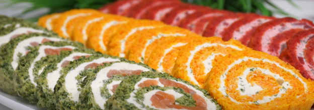 Это будут три разных по вкусу закусочных рулета такие рулеты можно приготовить заранее и заморозить.