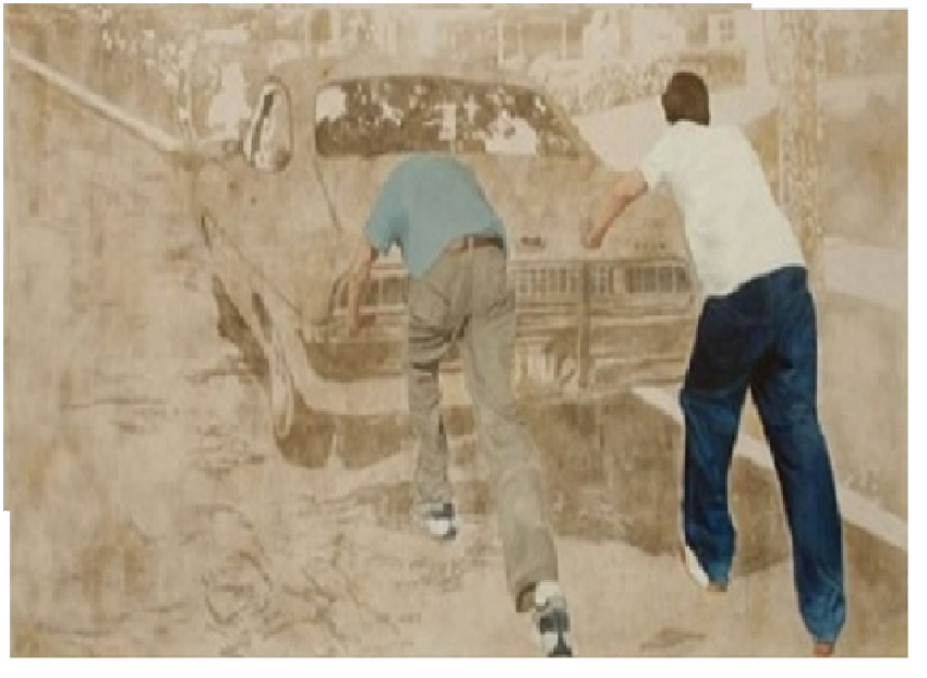 Затем она рисует человека с фотографии масляными красками, а задним фоном наносит пыль – намазывает клей на холст, а затем наносит пыль. Для создания света она берет кисточку и избавляется от лишней пыли, а для создания теней – смешивает пыль с акриловой краской. В конце работы Элисон покрывает картину лаком, чтобы картина не вызывала аллергию и не растеклась.
