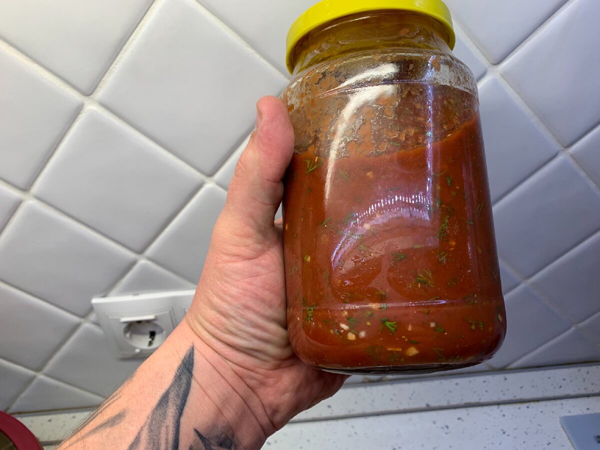 В банку вываливаем томатную пасту и смешиваем с чесноком, нарезаем укроп и кинзу