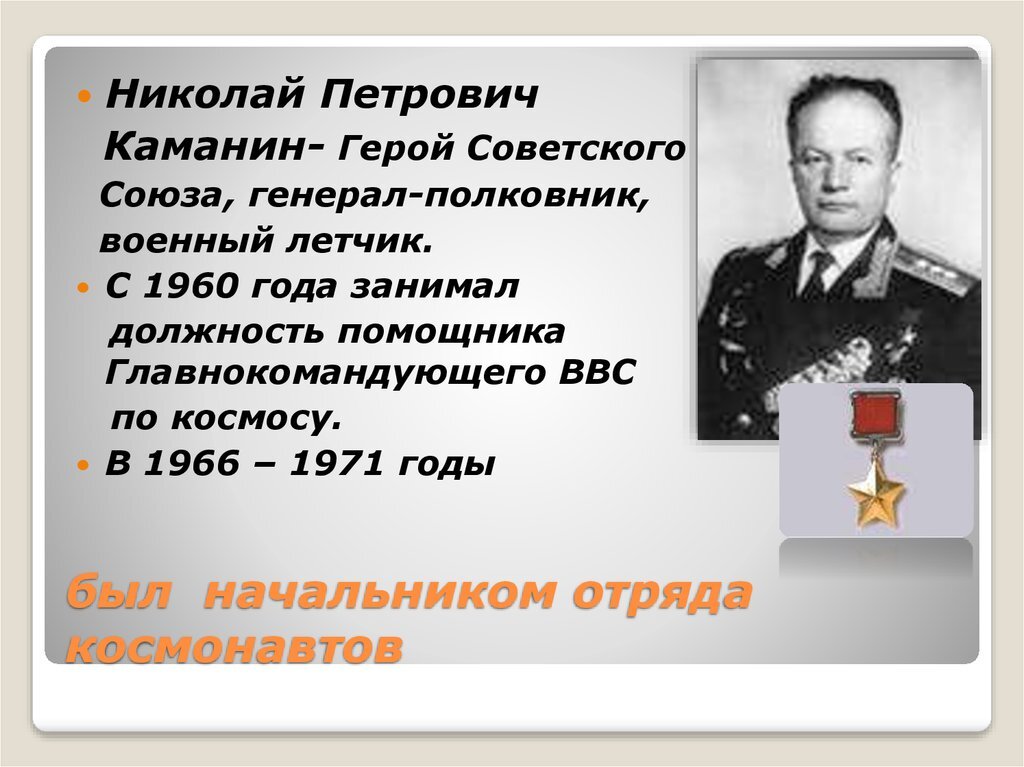 Николай Каманин - "С 1960 года Каманин руководил отбором и подготовкой первых советских космонавтов. С января 1961 годах осуществлял эту работу официально, находясь в должности начальника отдела по подготовке и обеспечению космических полётов Главного штаба ВВС. В 1966—1971 годах занимал должность помощника Главнокомандующего ВВС по космосу."