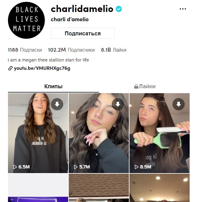 Сharli d’amelio (@charlidamelio) из Штатов всего 16 лет. Но в своем столь раннем возрасте она стала первой в TikTok, кто набрал более 100 миллионов подписчиков! Всего за полтора года она достигла такого результата. Возникает вопрос - как? Все просто. Платформа Тик-Ток - развлекательной направленности, и она покорила сердца своих подписчиков танцами.