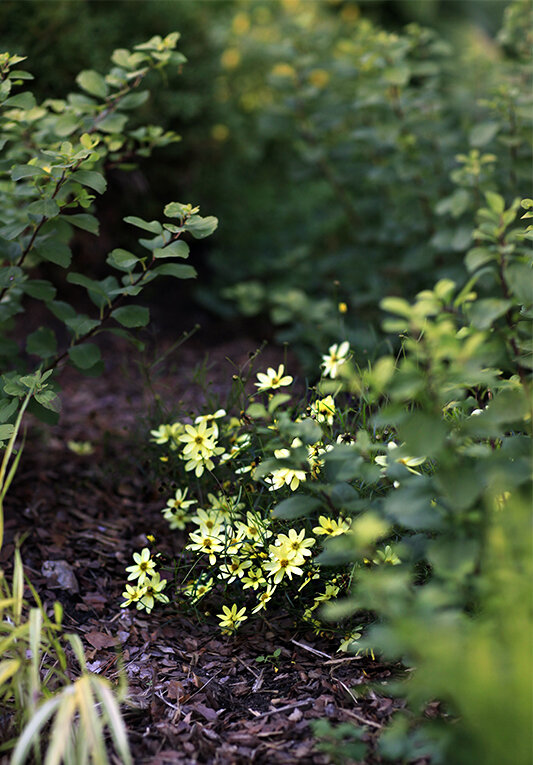 Часто в городских садах в качестве мульчи выступает щепа, окрашенная в разные цвета. Это худший из возможных вариантов. В природных садах подкрашенная щепа смотрится обычно слишком яркой и чужеродной, а кроме того, она очень медленно разлагается и требует много азота. Поэтому растения на грядках с щепой могут плохо расти, а цвет самой щепы иной раз затмевает растения.