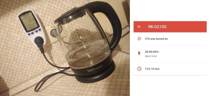 Чайник подключил в розетку через ваттметр с алиэкспресса за 500 рублей. Кроме того, чайник сам имеет умную начинку, которая подсчитывает потребленное электричество, поэтому мы имеем возможность сравнить результаты.