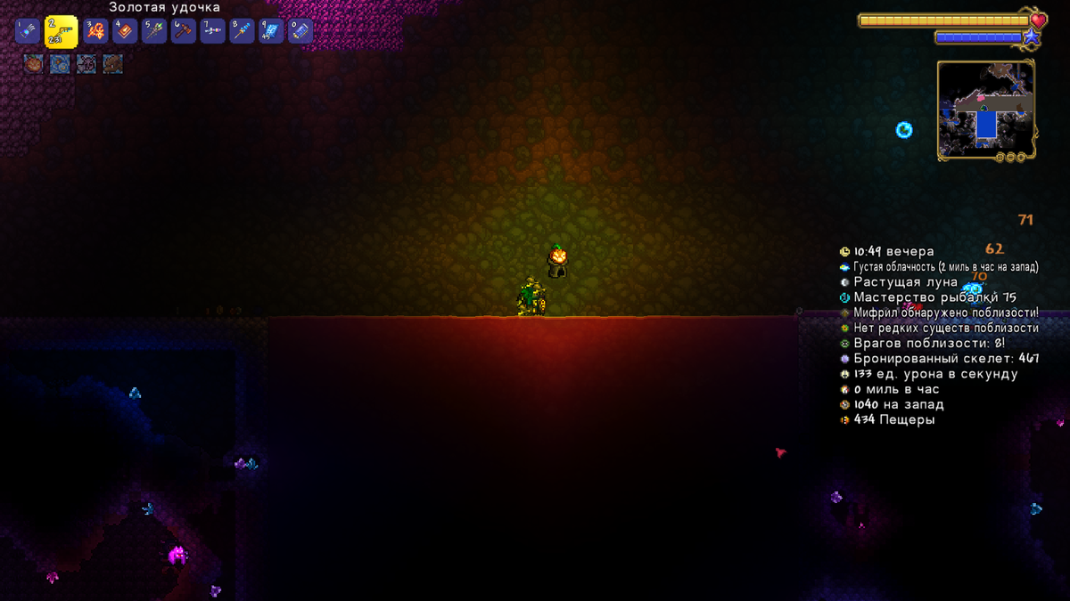 Новую часть приключений я решил начать с рыбалки. Нужно было больше призматической рыбы на зелья. И я вырыл пруд в пещерах освещения.
