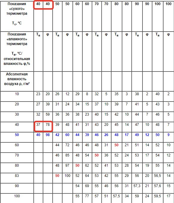 Смотрим на таблицу и понимаем, что 35-37 градусов по влажному термометру соответствуют большому количеству значений сухого в зависимости от влажности. Учитывая, что влажность в моечной будет расти, то комфортный температурный режим по сухому ~ 40 градусов. В таблице это 78% относительной влажности и 37 градусов по мокрому термометру.