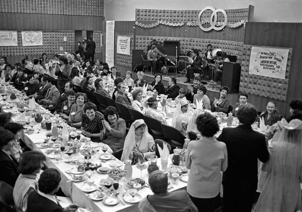 Как правило, такие свадьбы назывались комсомольскими. В конце концов, молодоженам стали выделать деньги в определённом количестве и банкетные залы. В обычных случаях празднование проходило дома –хозяйки устраивали праздничные столы, готовили праздничные угощения, гости благодарили подарками. Все сопровождалось песнями, плясками, весельем.