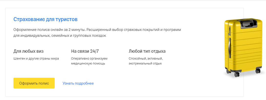 Интерфейс сайта tinkoff.ru оказался вполне дружелюбным и интуитивно понятным. На верхней панели, среди прочих услуг компании, значилось «Страхование». Перейдя в этот раздел, я без труда нашёл подраздел «Страхование для туристов» и с удивлением узнал об оформлении полиса онлайн за 2 минуты.