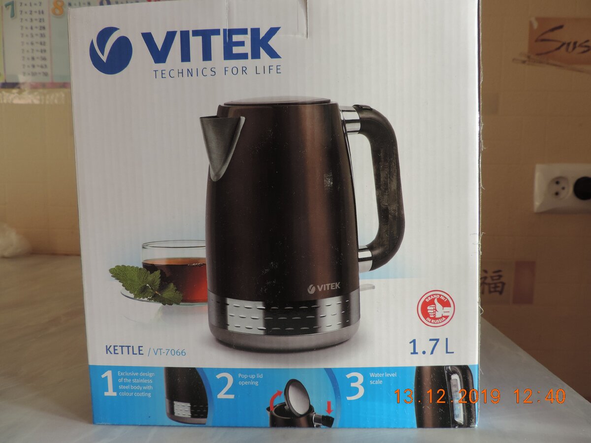 - В одном интернет магазине, я заказал чайник VITEK, который якобы стоил четыре тысячи рублей, но в день распродажи он стоил 1990 рублей, по-моему, это просто развод, но что делать товар был мне необходим. Прождав около двух недель, покупка была мною получена в центре выдачи товаров. Коробка, в которой был чайник, мне показалась очень маленькой, я подумал, что мне продали чайник с меньшим объемом для воды. Я заказывал объем 1,7 л. Но распаковав покупку, убедился что, объем тот самый, который и был нужен. Просто, оказалась обманчивая упаковка.