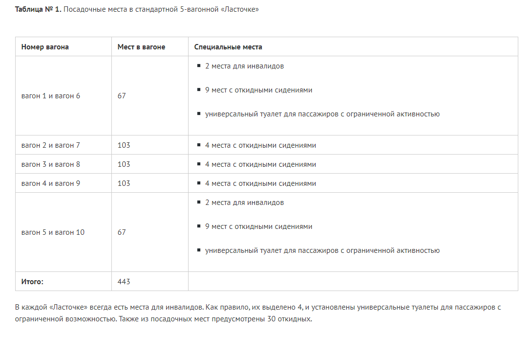 В каждой «Ласточке» всегда есть места для инвалидов. Как правило, их выделено 4, и установлены универсальные туалеты для пассажиров с ограниченной возможностью. Также из посадочных мест предусмотрены 30 откидных.