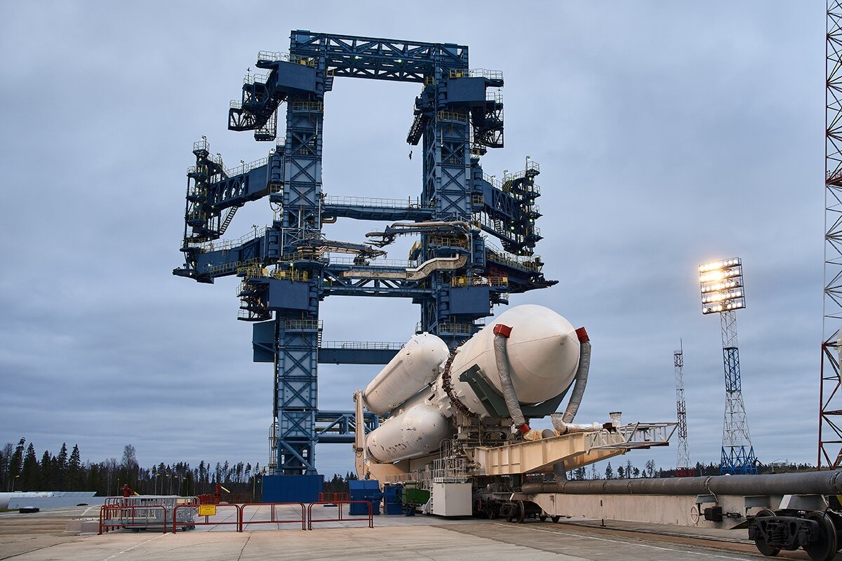 Установка тяжелой ракеты-носителя «Ангара-А5» на стартовое устройство на космодроме Плесецк.