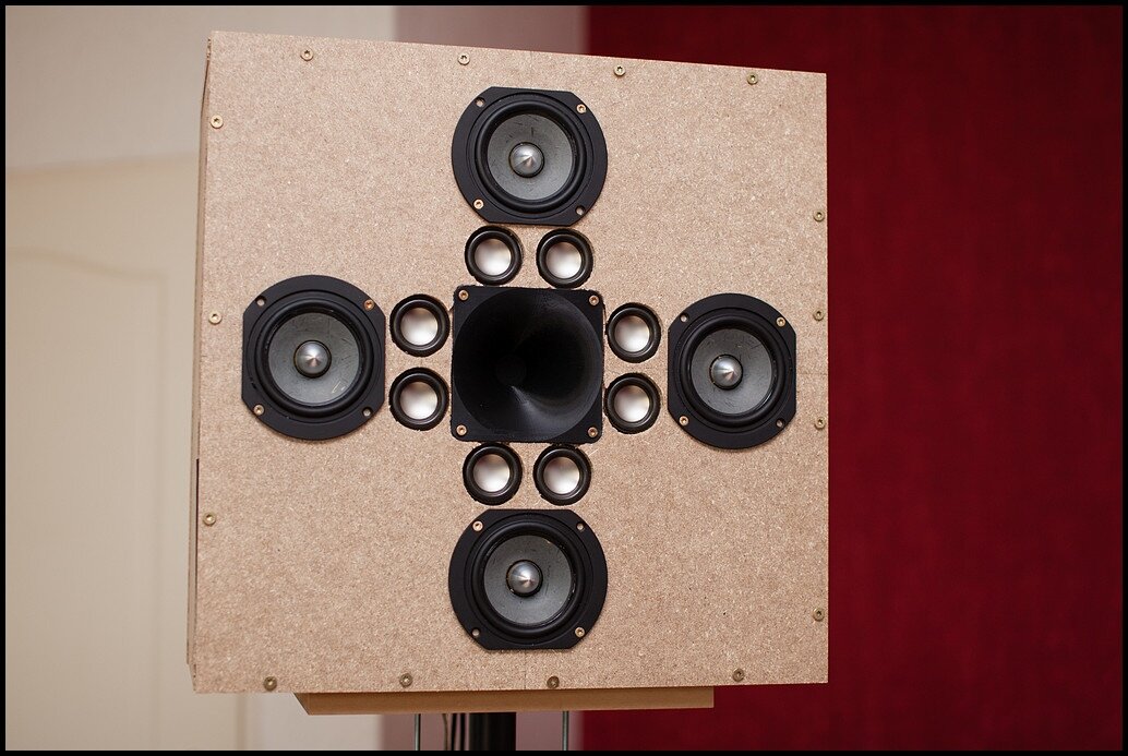 Итого это трёхполоска с 4 каналами обработки и усиления. Я так понимаю, один канал пошёл на боковые мидбасы; второй — на передние; третий — на твиттеры по вертикальной оси, поделенные в пассиве с ленточным твиттером на рупоре; и четвёртый канал обработки пошёл на боковые твиттеры, которыми посредством фазового согласования как раз настраивается горизонтальная дисперсия.