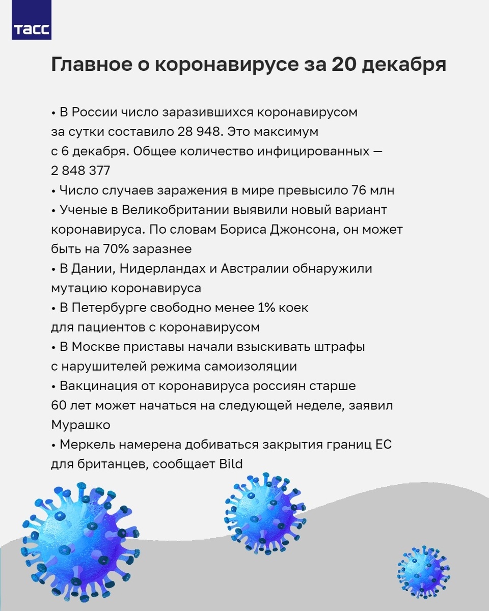 В Евросоюзе боятся распространения мутировавшего коронавируса. Собрали главные новости о пандемии за 20 декабря: