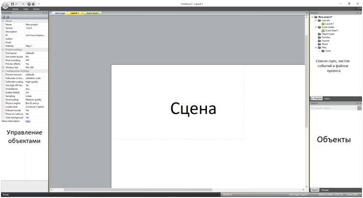 Начать хотелось бы с аудитории среды. Construct используют в своих проектах преимущественно студенты и начинающие разработчики. Почему так? – спросите вы. Потому что написать свою первую игру на этом движке намного проще, чем на других. Если вы не планируете делать свой первый проект сложным и объёмным по своей структуре, то вам прекрасно подойдёт Construct. У вас, наверняка, до сих пор остался вопрос: почему так? Ответ очень прост: для реализации простого проекта вам не потребуется писать ни одной строчки кода. Эта исключительная особенность и делает движок популярным среди родственных, таких как: Unity, Gdevelopи Gamemaker. Constructза время своего существования был выпущен в трёх версиях. Первая версия движка Construct Classic была выпущена в 2007 году и поддерживалась разработчиками на протяжении 5 лет с момента выпуска. Construct 2 выпустили в 2011 году и её поддержка длится до сих пор: последняя версия была выпущена 3 августа 2020 года. Construct3 был представлен в 2017 году, однако на данный момент его предшественник пользуется у разработчиков игр большей популярностью. Я расскажу вам о движке на примере как раз второй версии, поскольку она на данный момент наиболее популярна и я с напарником использовал именно эту версию при создании нашей первой игры.