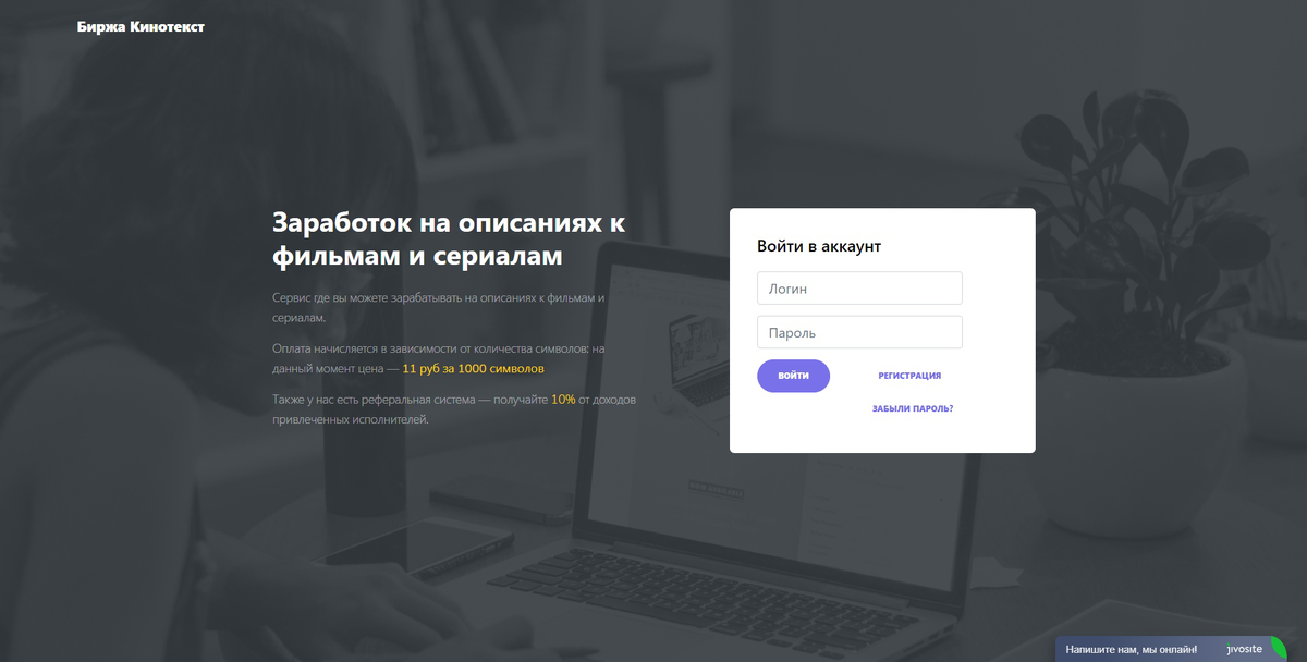 Салют друзья! На данном сайте, вам будут платить за вашу умственную работу - вы ему текст, а он вам деньги. Вам нужно будет придумывать описание к фильмам, сериалам, мультфильмам и т.д. Главное требование - уникальность текста, но рерайт никто не отменял.