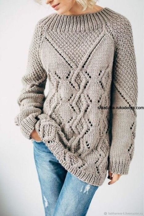 Для вязания свитера спицами реглан Вам ПОТРЕБУЕТСЯ: Пряжа (50% натуральной шерсти, 50% полиакрила; 55 м/50 г) — 750 (800) г бежевой; спицы №7; круговые спицы №6.