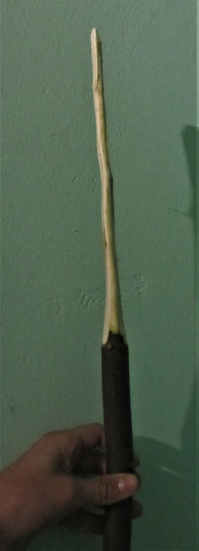 Оба конца рожна затачивают: нижний (круглый) конец должен втыкаться в землю, верхний (плоский) в рыбу.