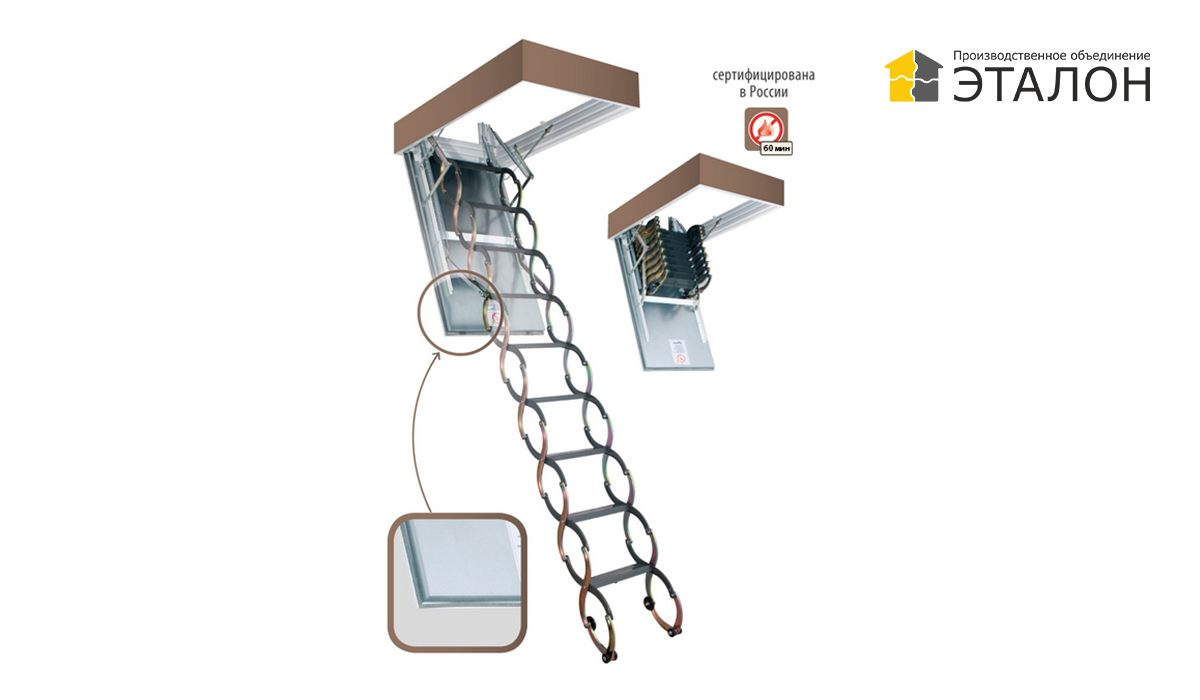 Лестница изготовлена из оцинкованной стали. Сегменты ножничного типа обеспечивают простоту раскладывания и складывания, комфортный и безопасный подъем.