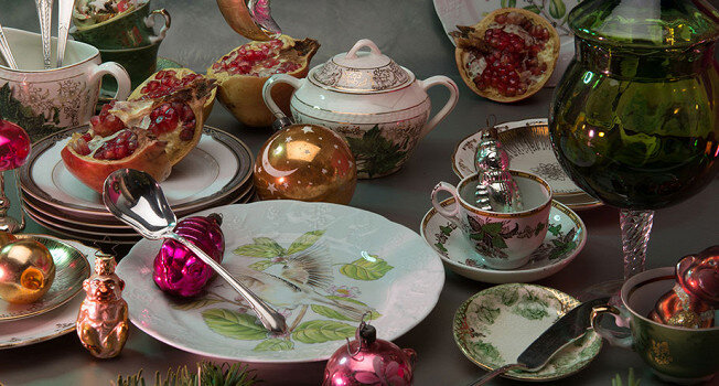 «Здесь собралось все, как елка, зеленое и с праздничными рисунками. Такая новогодняя витрина, где много-много всего, и хочется все долго-долго разглядывать. Вазочки-тарелочки-чашечки, и во всем лежат зефиры-конфеты-мандарины, и все можно взять — и глаза разбегаются. Правда, я вместо всего этого использовала елочные игрушки — ими на самом деле здорово украшать стол. Молочник английский, 1953 года, в превосходном состоянии, а у сахарницы самая настоящая трещина — ее хорошо видно на картинке. Зеленая стеклянная конфетница японская, для праздника вещь отличная: в нее можно положить светодиодную гирлянду на батарейках, и она будет по-новогоднему сиять».