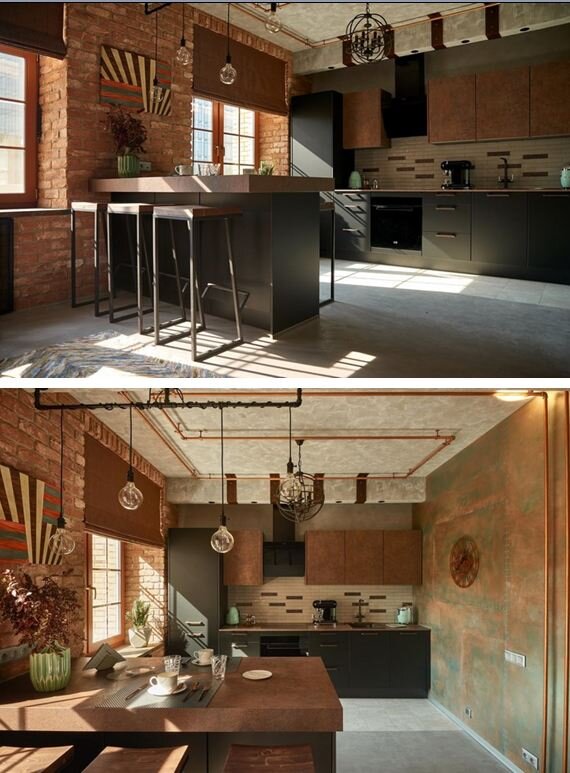 Красавица, умеющая себя преподнести, всегда интересна. Одна из ярких на российской эстраде. Квартира в Москве полностью передаёт её образы. Выбор пал на индустриальный лофт, поэтому на окнах красуются лаконичные портьеры серо-коричневого цвета. Они строги, при этом идеально сочетаются с римскими шторами терракотового оттенка. Такой ансамбль делает отделку стен и мебельные фасады более яркими.