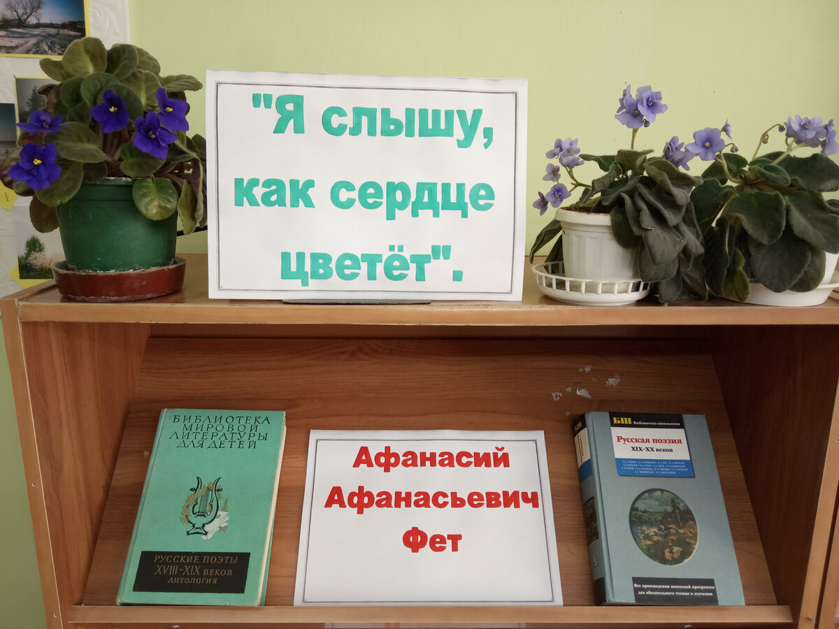 5 декабря 2020 года исполняется 200 лет со дня рождения известного русского поэта-лирика и переводчика, мемуариста, члена-корреспондента Петербургской академии наук Афанасия Афанасьевича Фета. К этой дате в Никульевской библиотеке МБУК "МЦРБ" оформлена книжная выставка – восхищение "Я слышу, как сердце цветёт". Стихи Афанасия Фета знакомы нам с детства. Основная тема его поэзии – пейзажная и