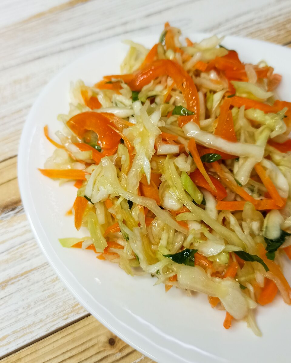 ✅Морковь натереть на крупной тёрке, перец нарезать, добавить к капусте.