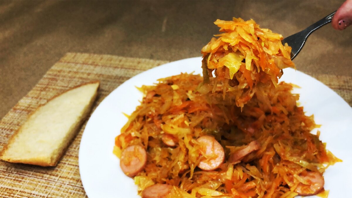 Добавляем сосиски и оставляем тушится на 5-7 минут и капуста готова, можно подавать к столу!