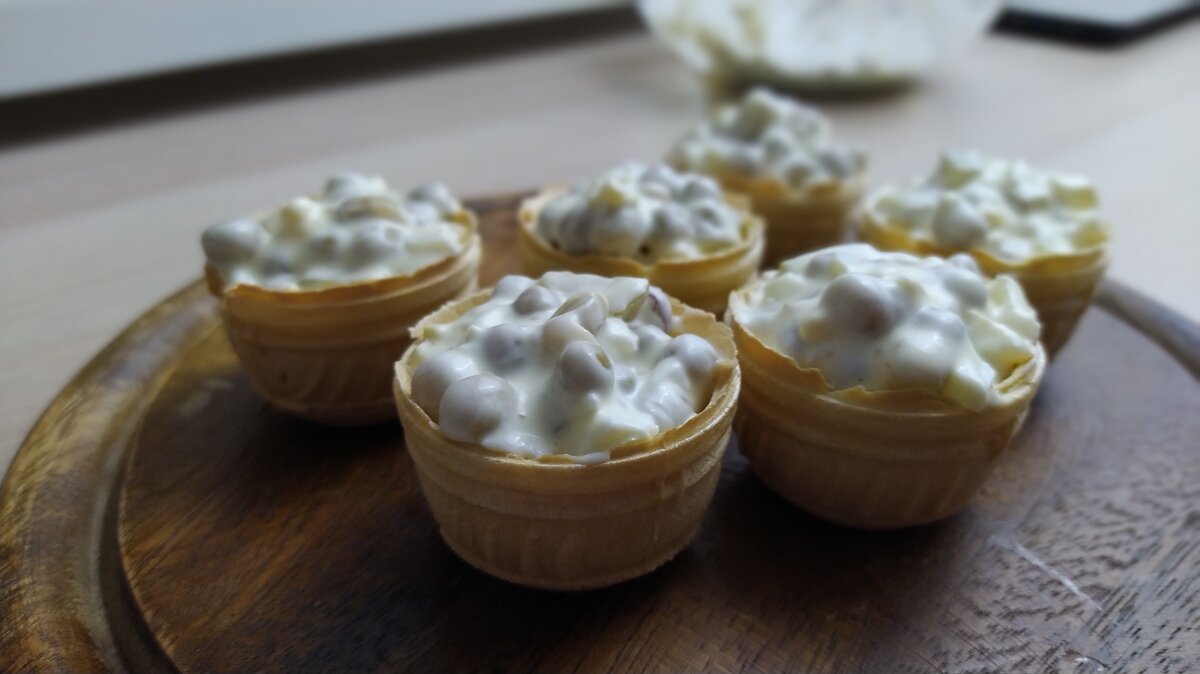 Тщательно перемешиваем и выкладываем заправку на тарталетки. Можете использовать вафельные или песочные. Также можно сделать гренки из батона и выкладывать начинку на него.