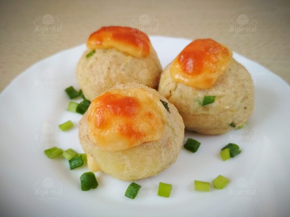 У меня осталось немного сыра, я его нарезала и положила сверху на каждый шарик. Отправляем наше блюдо в духовку, разогретую до 200° С, на 15-17 минут: