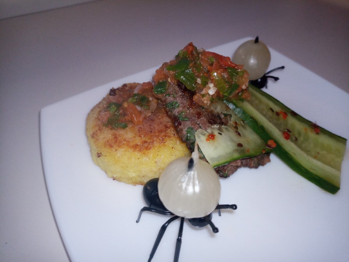 Из фарша сформировать «котлетки» и обжарить на сильном огне по 1 минуте с каждой стороны (получится средняя прожарка). Из картофеля сформировать биточки произвольной формы на свой вкус. Обвалять в сухарях и обжарить до золотистой корочки.