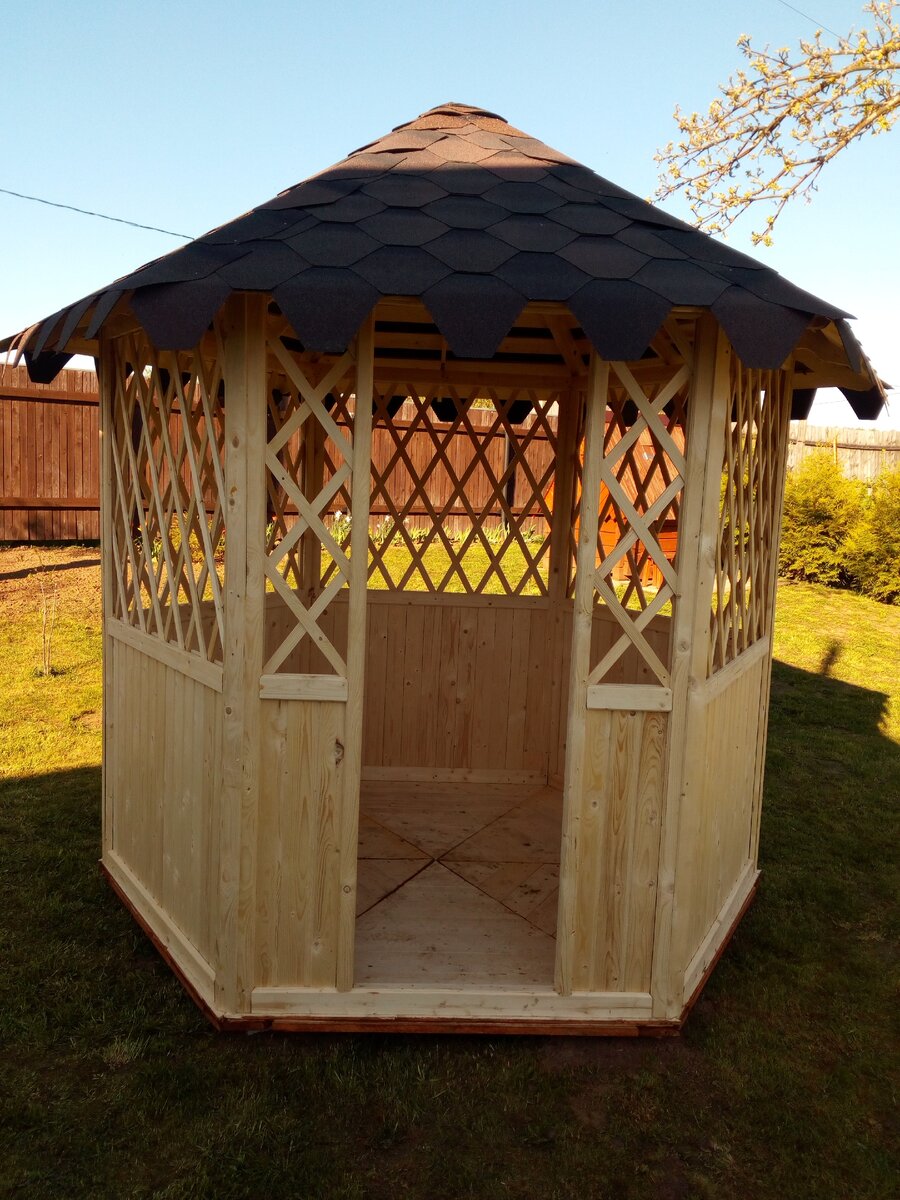 Про качество изготовления и сборку, говорить не буду, оставляет желать лучшего, поэтому пришлось приложить немало усилий, чтобы устранить все "косяки" и довести беседку до потребного вида. Теперь она выглядит так.