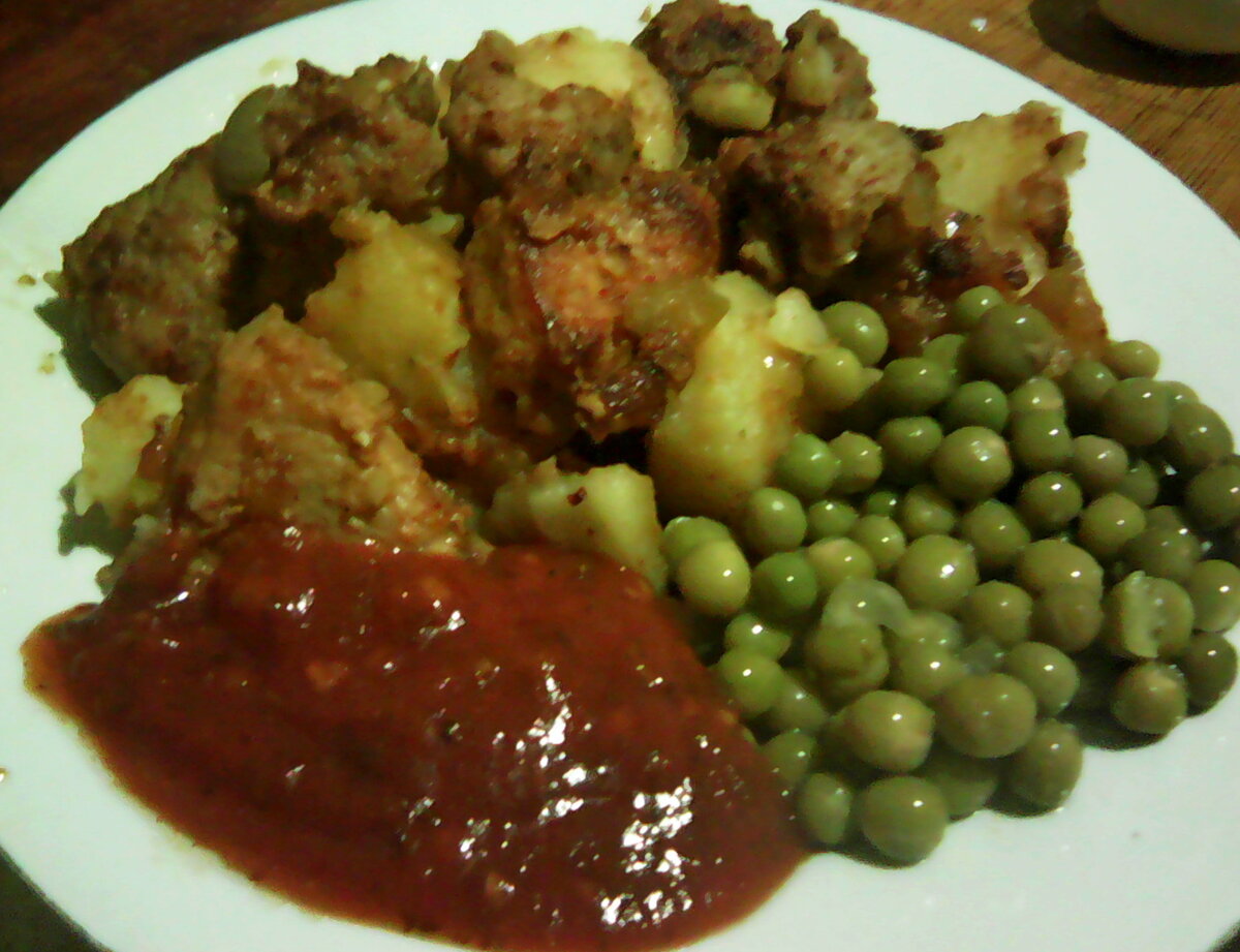 Выкладываю мясо и картофель на тарелку, гарнирую горошком и соусом. Можно приступать к трапезе.