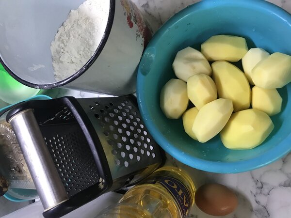 1. Картофельные клубни хорошо вымываем, чистим от кожуры и натираем на терке со средними перьями. Хорошенько отжимаем от не нужной влаги.