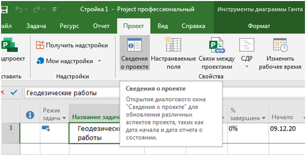 Как указать дату начала или завершения проекта