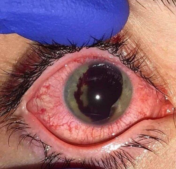 Женщина, 42 года, доставлена после ДТП. Помимо нескольких переломов наблюдается также травматический ирит и гифема (кровоизлияние в переднюю камеру глаза).