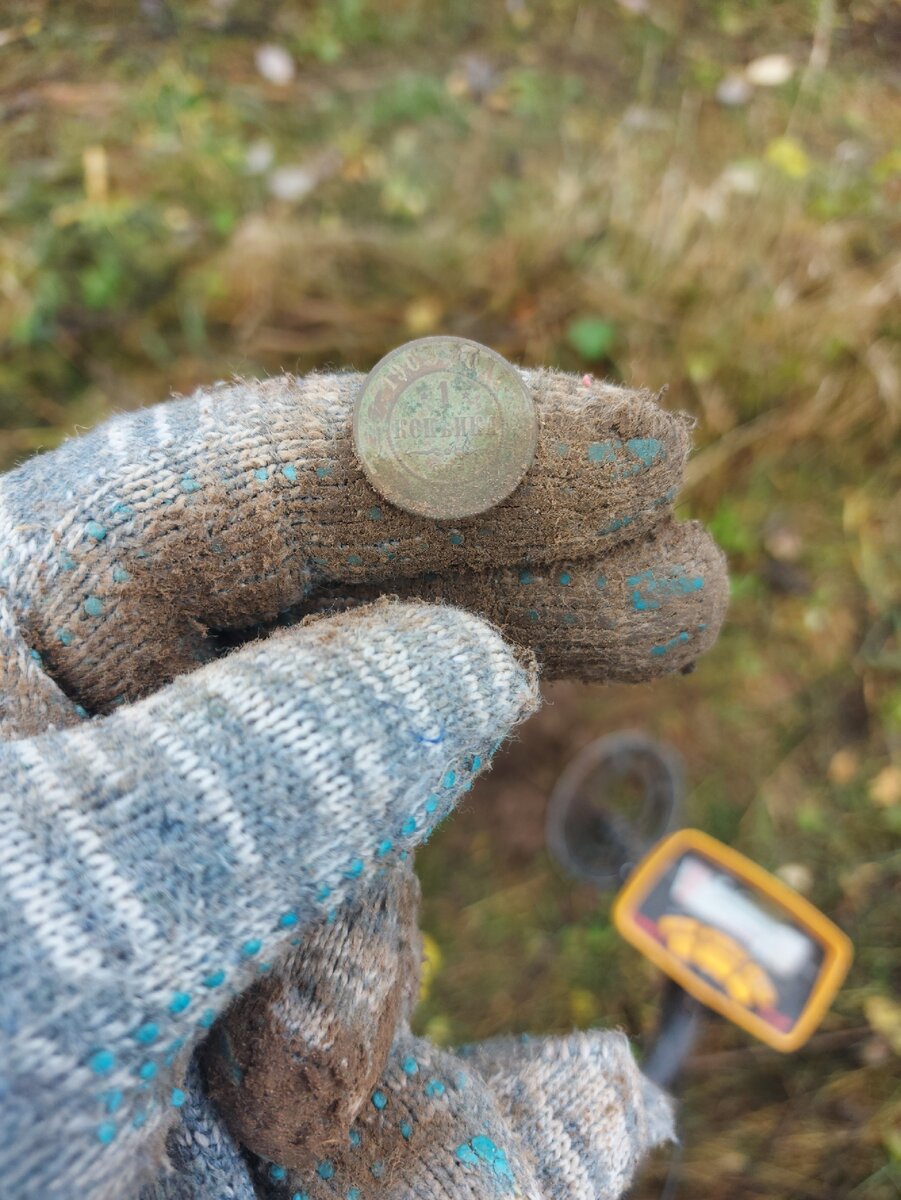 Доброго времени суток! Рад всех приветствовать у себя на канале. Число подписчиков уже перевалило за 200, а именно стало 202. На момент написания статьи было именно такое количество. Еще раз спасибо каждому, кто подписался, ставит лайки и пишет комментарии. Теперь о копе. Был конец октября, стояла достаточно хорошая погода. Еще и дождя не было! План на коп был такой. Пройти перспективную часть леса и все-таки найти топор! Включил прибор и приступил к делу. Начал с противоположного края. Полезный сигнал не заставил себя долго ждать. Первой находкой оказалась одна копейка Николая Второго. Стандартная, 1903 года. По состоянию ничего такая. Решил сделать фотографию, природа перепутала уже все. Думает весна, а это скоро зима. Снова пуля, читал подобный формат отличается от предыдущих. Там как-то по моделям ружей. Под деревом нашел кусочек пряжки. Прикольный такой, мне нравится. Правда, скорее современный. А вот не так далеко от нее, лежал он! Красавец! Мне кажется царский. Форма, во всяком