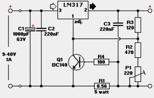 При достижении заданного уровня тока напряжение на R1 увеличивается, транзистор размыкается и шунтирует регулировочный вход LM317 на отрицательную шину питания, тем самым снижая выходное напряжение. Предельный ток можно рассчитать по простой формуле 0,6/R1 и для номинальных значений, указанных на схеме, составляет примерно 1 ампер.
